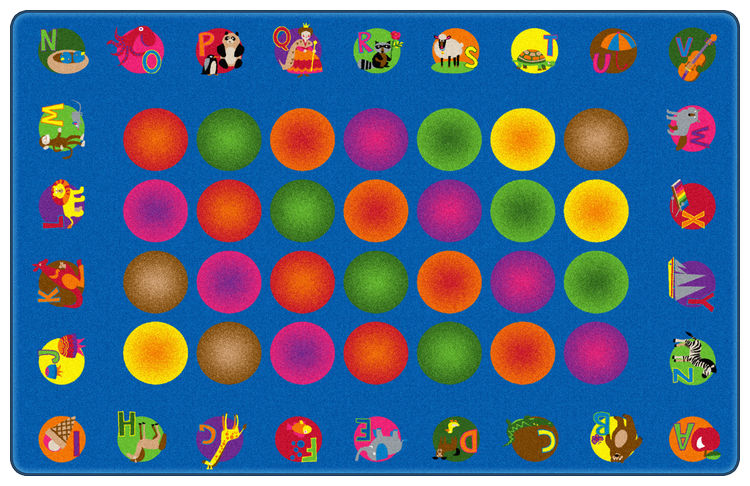 Joy Carpets Oversize Alphabet Rug. Chunky, bold letters in bright, vibrant colors create a cheerful ABC Rug centerpiece for any preschool or elementary school classroom. Familiar shapes in each corner are there to practice counting, 1, 2, 3, 4. This ABC Classroom Carpet, with its simple and stylish design, is full of lots of learning fun! Lifetime Limited Wear Warranty. 100% Premium WearOn Nylon with StainSmart anti-soil and stain protectant. SoftFlex Backing - Eliminates wrinkles and lies flat. Class I Flammability Rating. Green Label Plus - Highest Indoor Air Quality Standard. Made in the U.S.A.