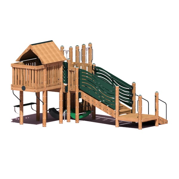 Discover a new world on the Robinson play structure. From afar, children will realize immediately that they will have much to explore. The core of the structure is a classic design that winds up to a Triple Slide on one side and a Hurricane Slide on the other. The two sides are connected by a central Hammock Net that children can enjoy climbing up and down for hours. On the far side this rope adventure continues with the Cargo Net that leads back to the ground. For those that want to reach the Hurricane Slide immediately, a Climbing Wall awaits them. What makes this structure so exciting is its split. The main structure offers one set of activities and right next to that structure is an area of overhead climbers. The Handring Climber begins this section of the fun with a Chinning Bar available right next to it. Perpendicular to it is a Curved Overhead Climber that completes the playground.