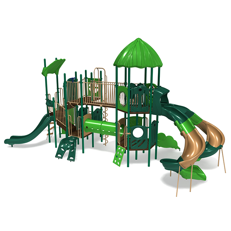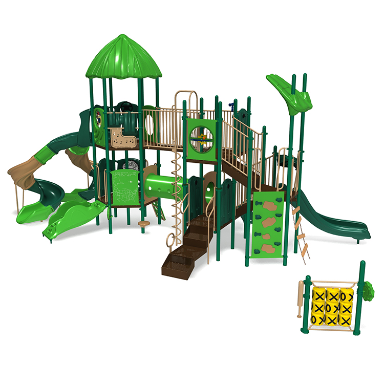The Tarzan's Jungle playground is a structure kids will go bananas over! This jungle of a structure not only features a duo-level build but incorporates nearly a dozen different sensory play activities that are perfect for promoting early learning. Standing at an exhilarating 8' high, kids can race to the bottom of spiral slides before traversing back to the top via numerous different climbers of various styles from coil climbers to chain nets. At a capacity of up to 80 children, this is an amazing structure for elementary schools, cities, large religious organizations and more! Whatever your needs, you'll be sure to be the talk of the town (or jungle) with this immense playground structure for years to come.